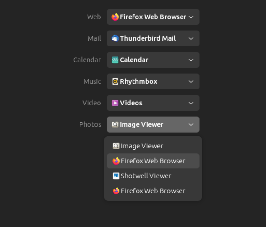 In Gnome 44 and before, in default apps section there were app icons before app names in select menus. In Gnome 45 and later I don’t know why it was deleted and there are only apps names.