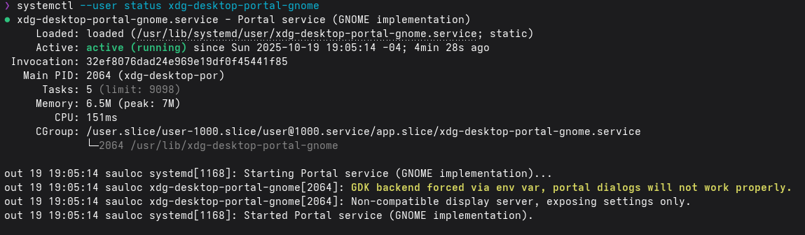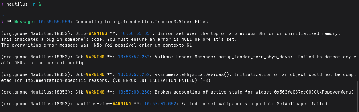 I can’t change the wallpaper, GNOME Settings doesn’t open Nautilus, and Nautilus can’t change with right-click. Show desktop icons is enabled, already tried gsettings, didn’t work too. Running Nautilus from terminal shows: