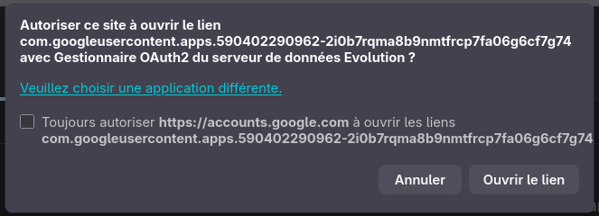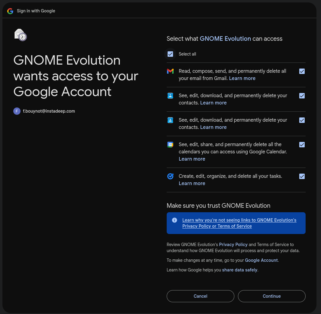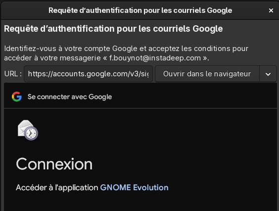 I’m using Evolution on my professional laptop running Fedora 43, with GOA configured to access my professional gmail account.