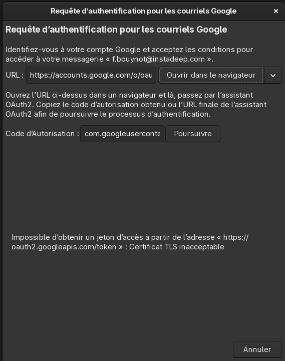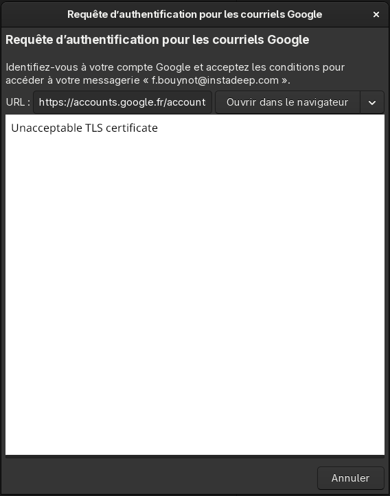 L’erreur signalée était « L’authentification a échoué: Impossible d’obtenir un jeton d’accès pour « xx@yy.com » : Échec de l’actualisation du jeton d’accès (goa-error-quark, 0) : Code 200 attendu lors de la requête du jeton d’accès, code 0 ((null)) reçu à la place ».