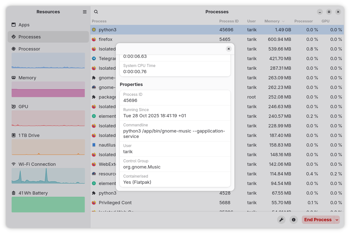 Gnome Music (Flathub) application uses a lot of RAM (1.49 GB of RAM). Gnome Music v49.1 OS: Fedora 43 Workstaion
