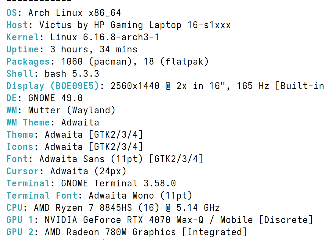 Hybrid laptop running Arch Linux (with CachyOS repos and kernel), with AMD iGPU and Nvidia dGPU. I also forgot to mention that this started happening since upgrading to GNOME 49.
