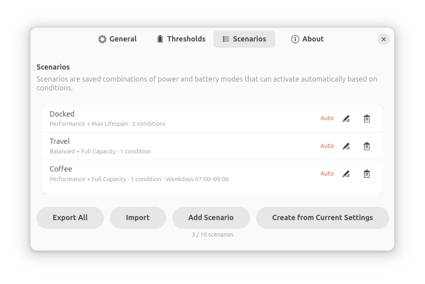 (e.g. “Docked” → Performance + 60% charge limit, “Travel” → Balanced + full capacity).