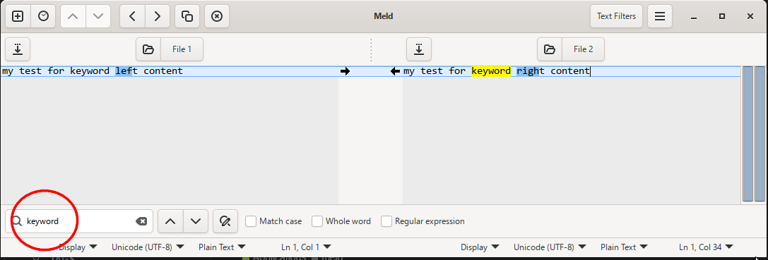 But as of Meld 3.22.2 (windows) when I search a term, and it is found, it is highlighted in yellow, and it helps, but it would help more if highlighted in both panels content, imho.