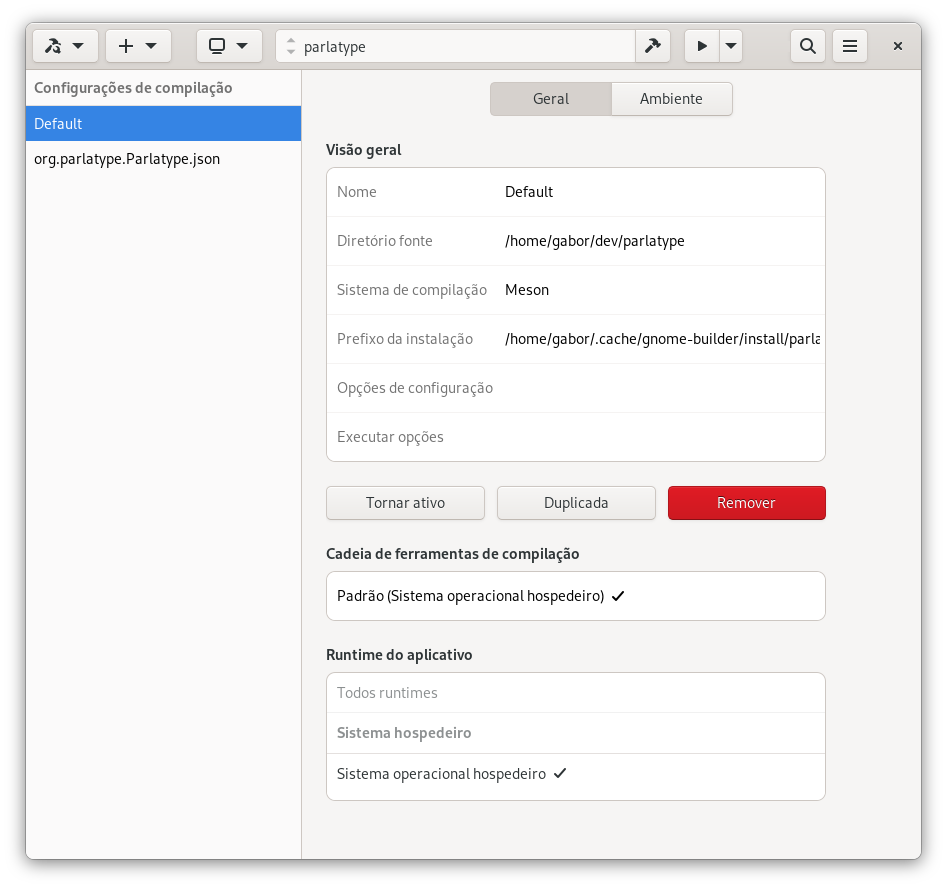 I use this “Default” setup, maybe you didn’t press “Tornar ativo”? The headerbar looks different, I usually press the “Run” (“Executar” CTRL+F5) button. Not sure what you mean with “export the software”. There is a grayed out button called “Export Bundle” (pt_BR: “Exportar pacote”). Do you expect it to create a tarball?