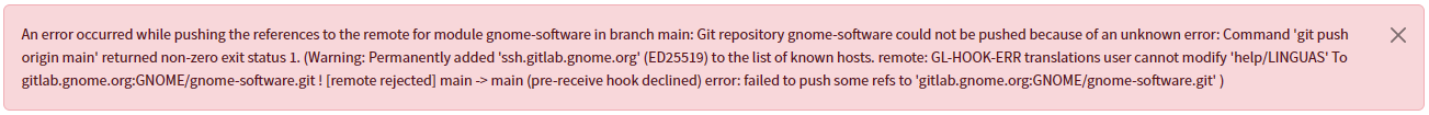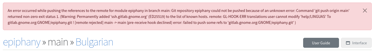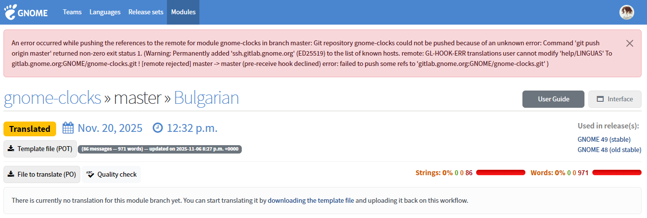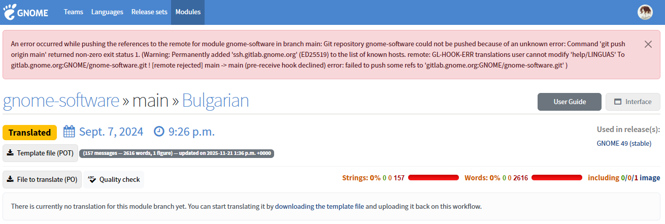 I am attempting to submit a new user guide Bulgarian translation for epiphany to GNOME 49 on damned-lies, however, I am receiving an error related to the repository and the submission fails because of it. I receive the exact same error with gnome-boxes and gnome-software, so it’s not specific to one repository: