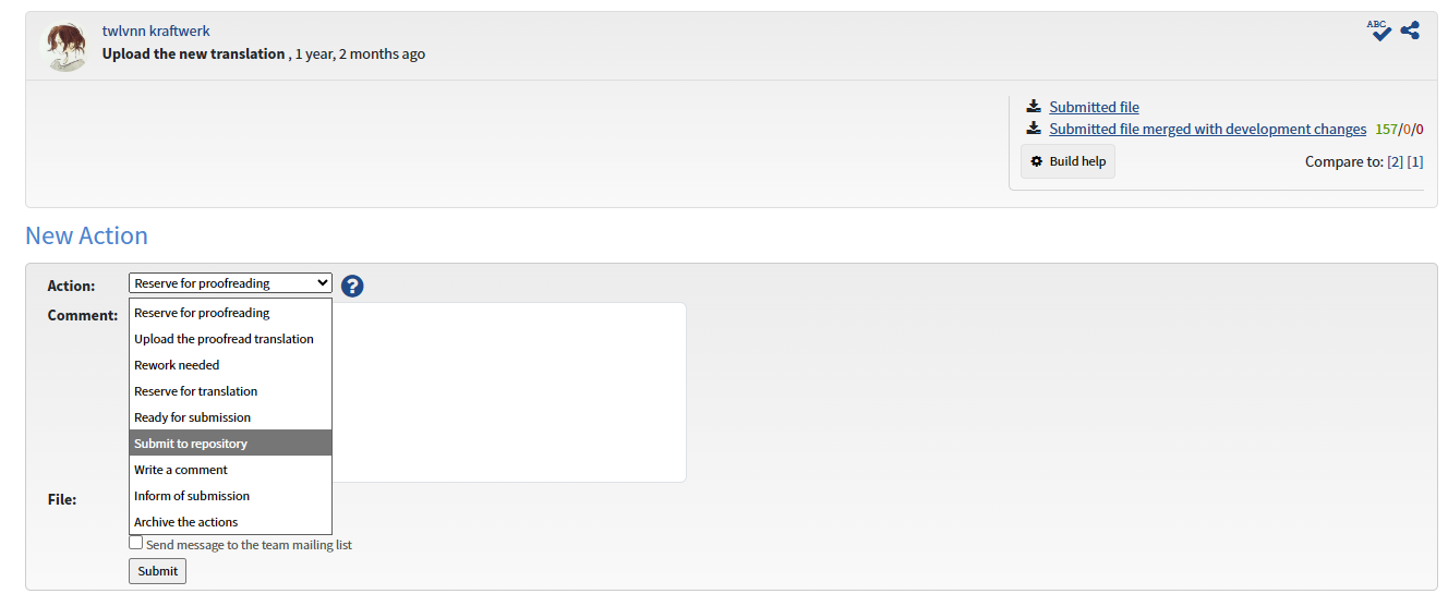 The “Compare to: [2]” option also shows the difference between the translation revisions, but I don’t think it has anything useful related to the git submission process.