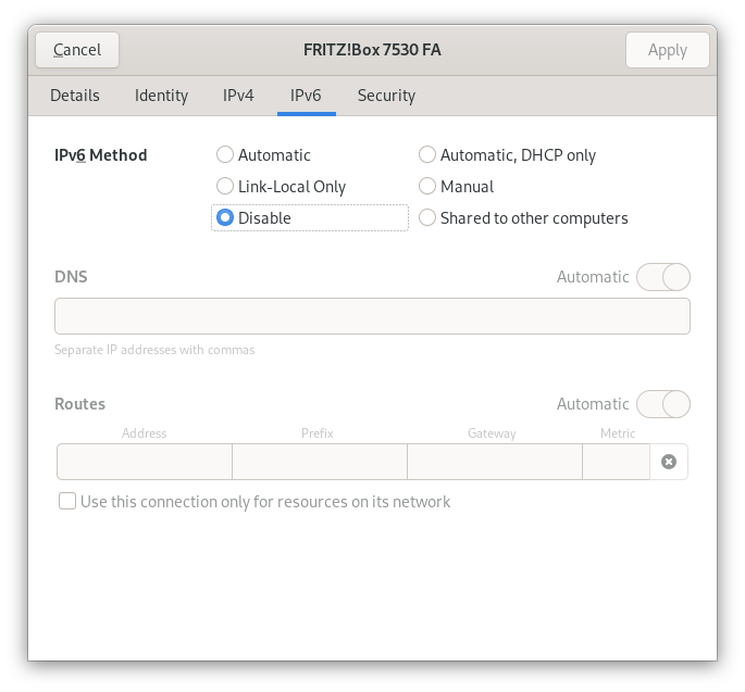 I tried disabling ipv6 in GNOME Settings, but the Apply button is not activated: