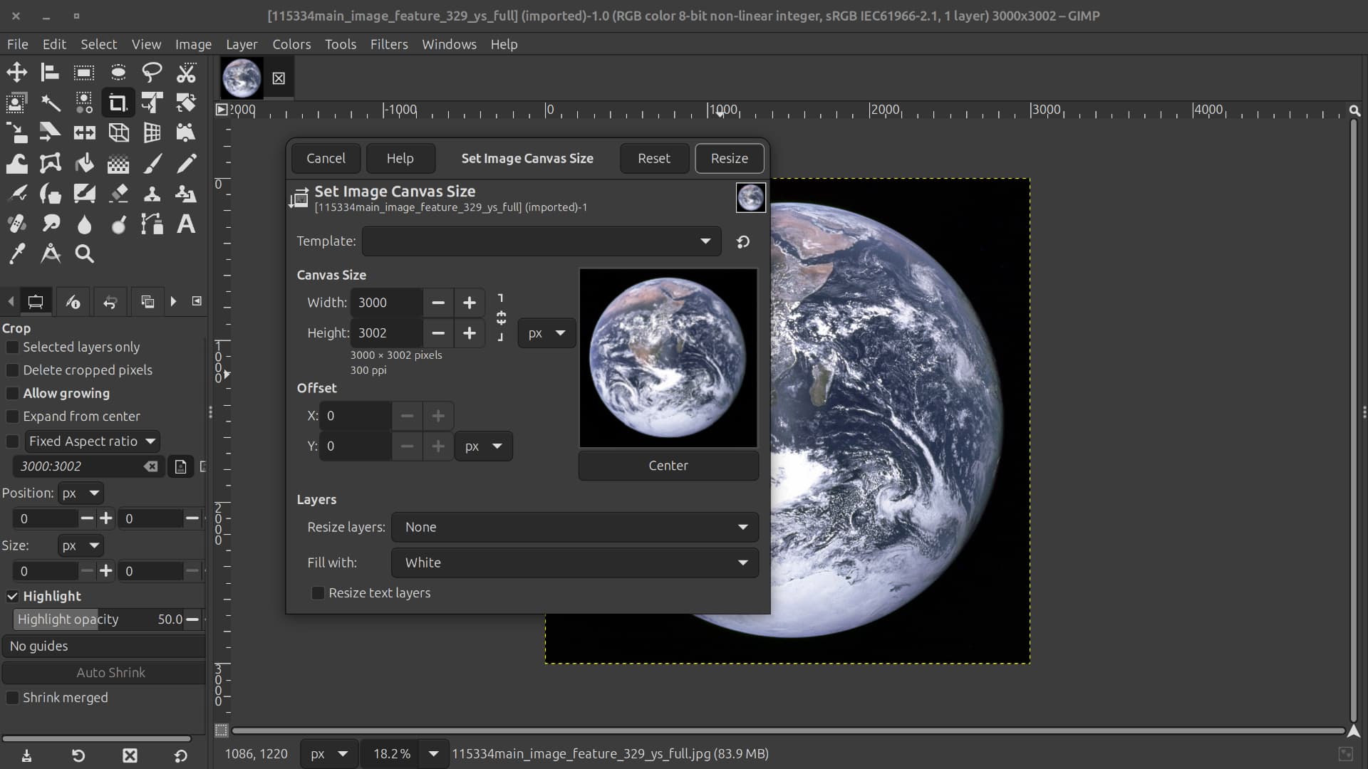 Is there a way to resize (bigger) the “Set Image Canvas Size window”?